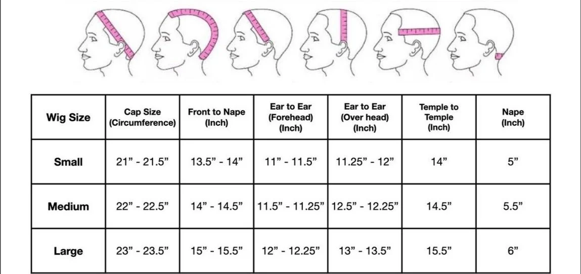 To determine the right size wig for you, measure the circumference of your head from the front hairline, behind your ear, to the nape of your neck, to your other ear and then back to the front hairline. Jot down your measurement then consult the table below. Please note that sizes may vary slightly by brand and that not all wigs are available in all cap sizes.